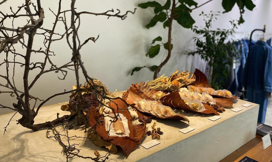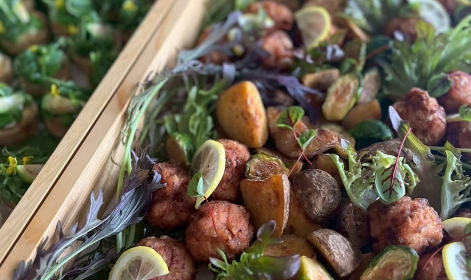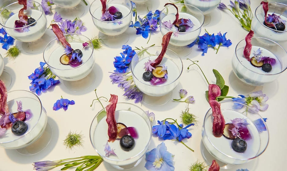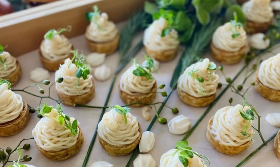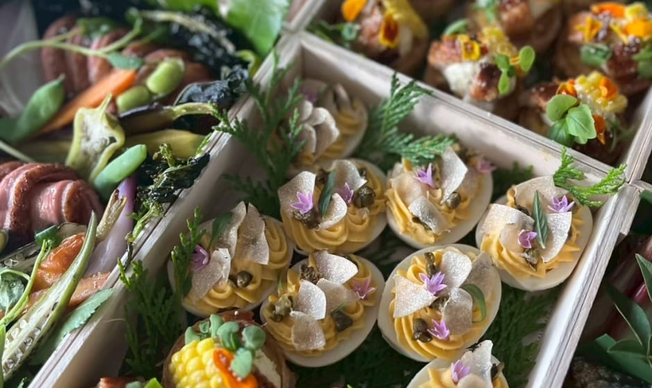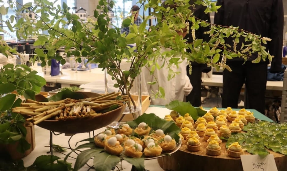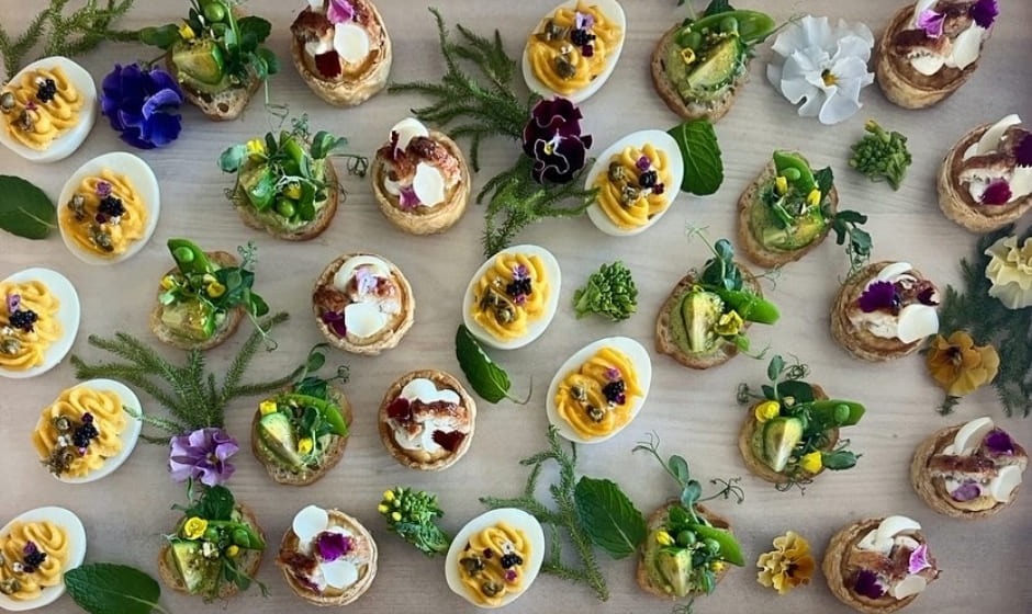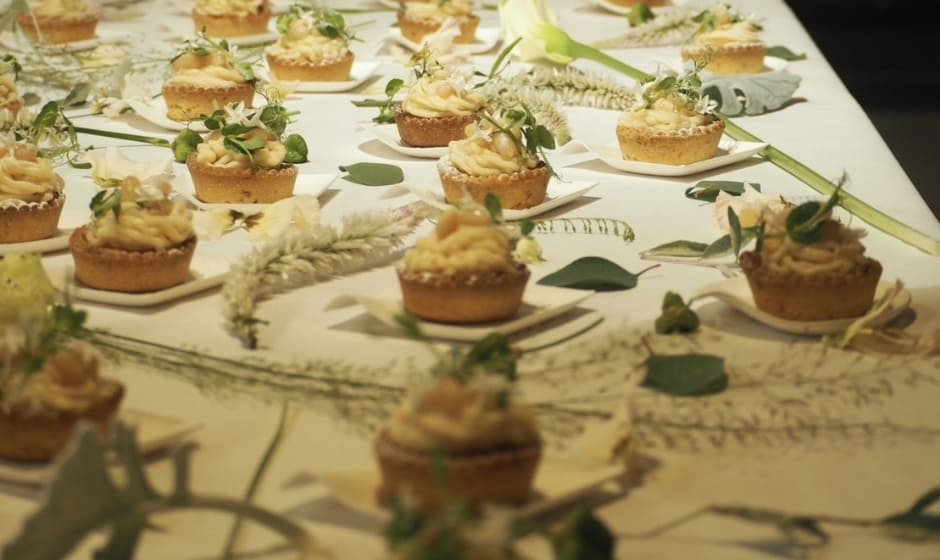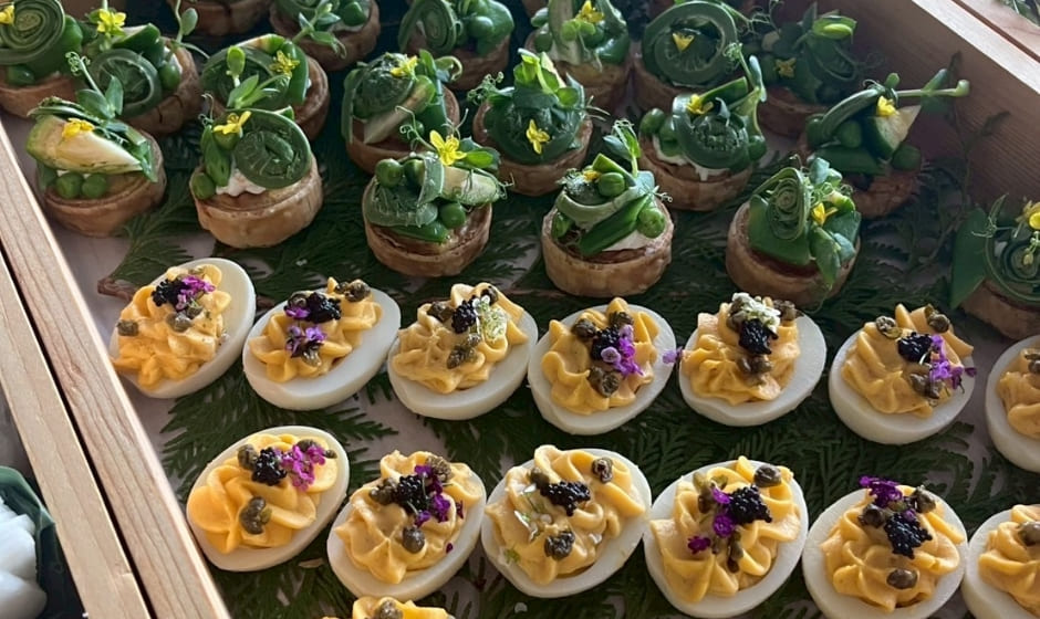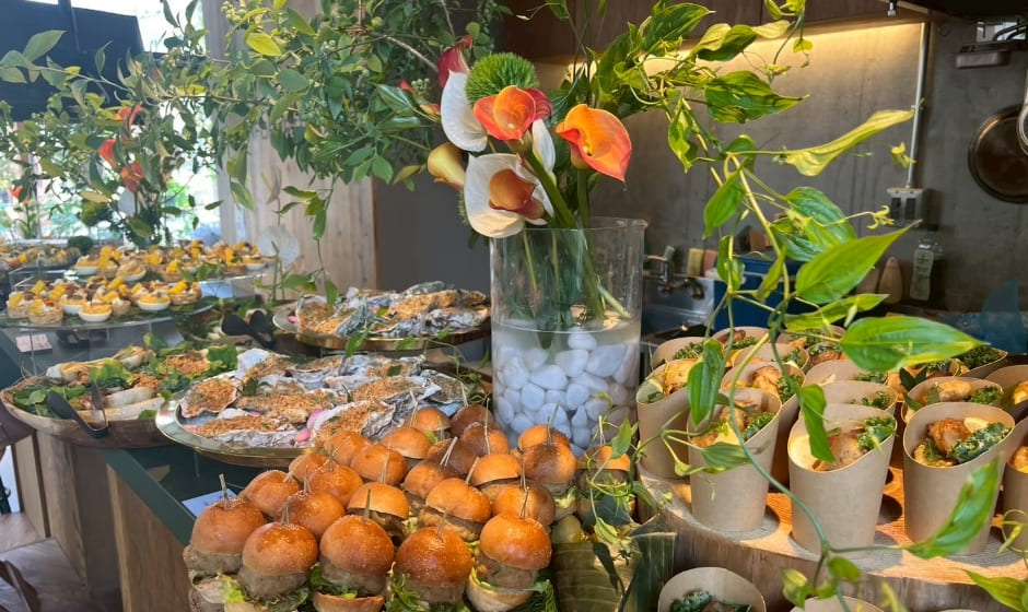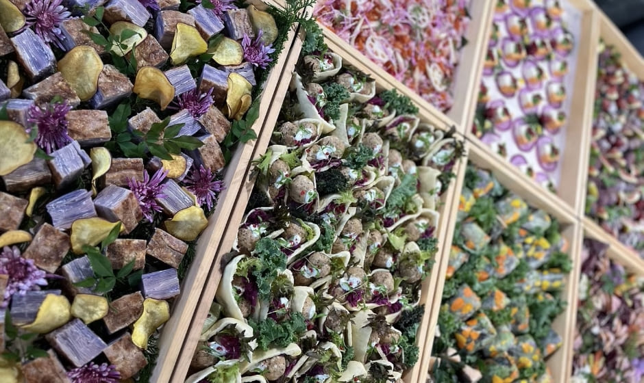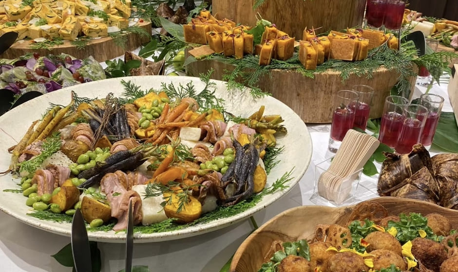 小さなフィンガーフードでも見た目が華やかになるよう、植物や什器を使い盛り付けさせていただきます。
