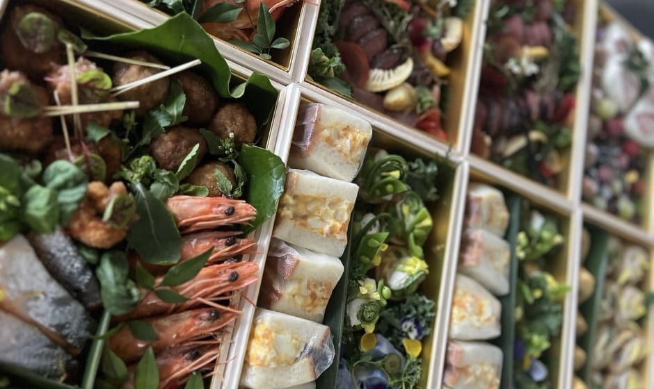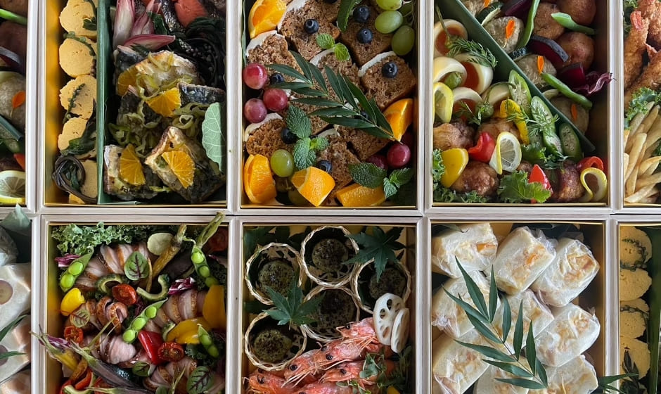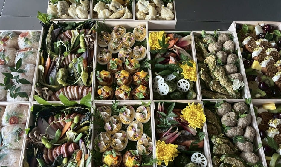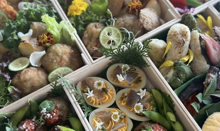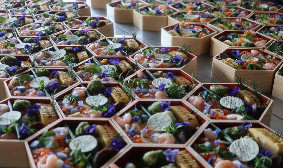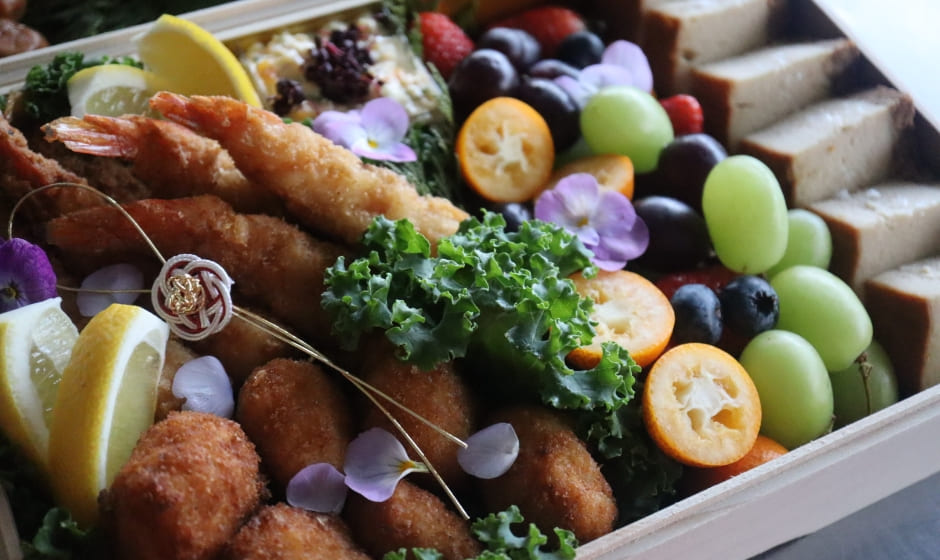 小さなフィンガーフードでも見た目が華やかになるよう木箱の隙間まで装飾させていただき、木箱を広げるだけですぐにお召し上がり頂けます。