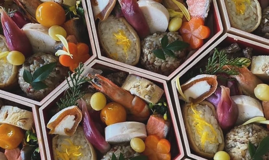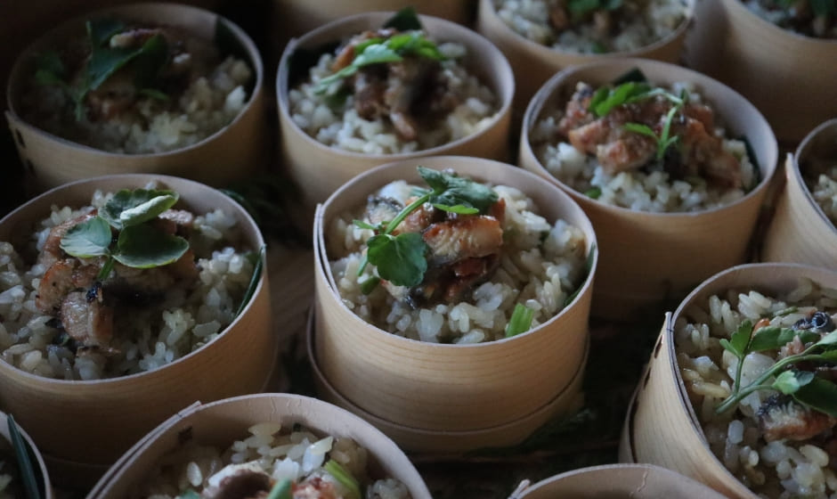 五郎兵衛米おむすび弁当長野県佐久市浅科村(あさしな)で作られる「まぼろしのお米」をとも呼ばれる貴重なお米を使用。浅科村の強粘土質な土壌で育ったお米は、粘りと甘みが強く冷めると独特のミルキーさがあります。美味しいお米を土鍋で炊き、シンプルに塩むすびで。旬の食材を使ったお惣菜5種類ほどと一緒に竹皮包んだ贅沢なおむすび弁当。
