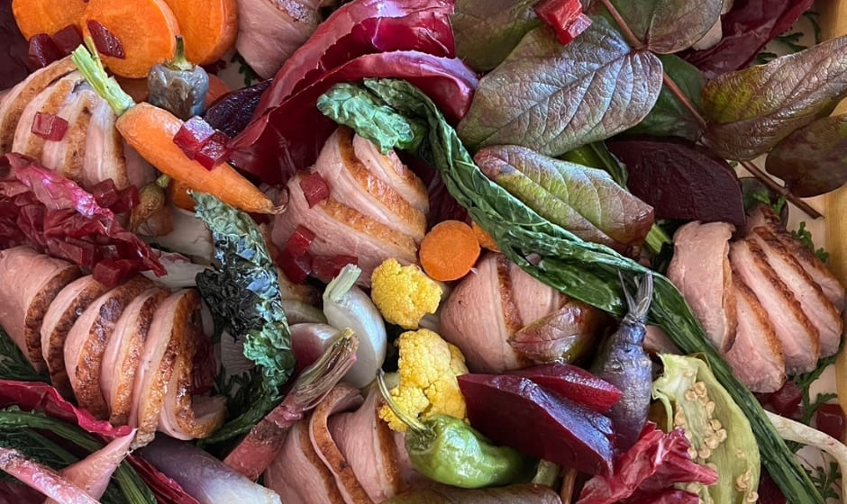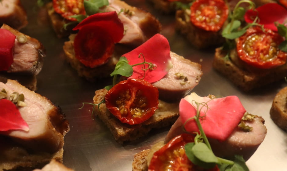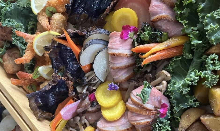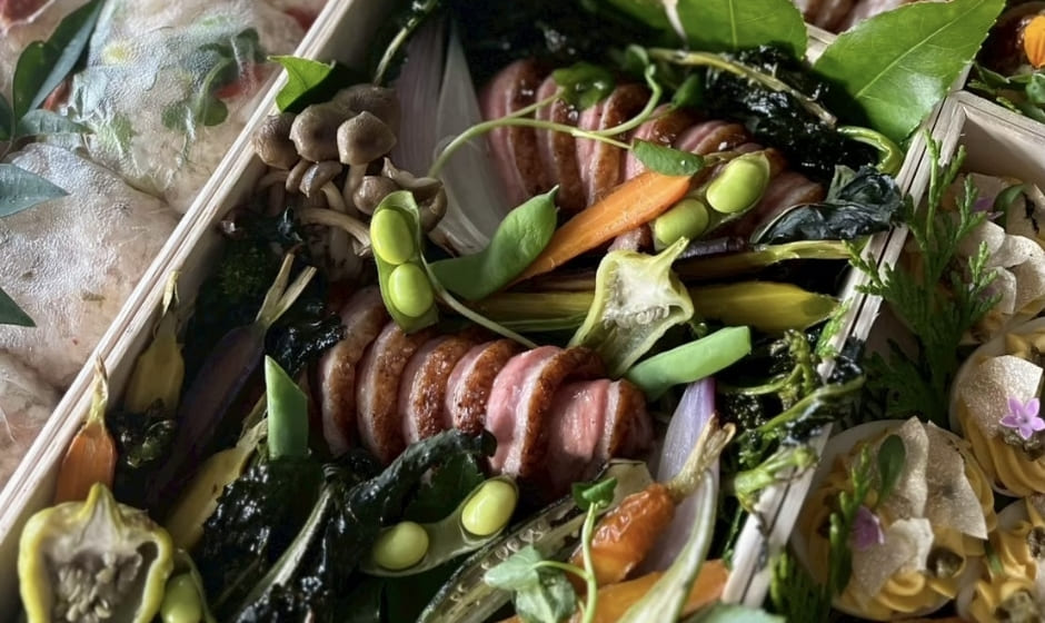 ・メニュー例:鴨胸肉のロースト・帆立とブラータ、シャインマスカットの生春巻き・ライムリーフの唐揚げ・ズッキーニと無花果の白和え・海老の椎茸真薯・鮭の酢橘幽庵焼き・牛サガリのクロケット・南瓜とバニラのテリーヌ・落花生の古賀焼き・木の子のちまき・自家製リエットとリンゴのサンドイッチ・スパイスチーズケーキ・季節のフルーツなど