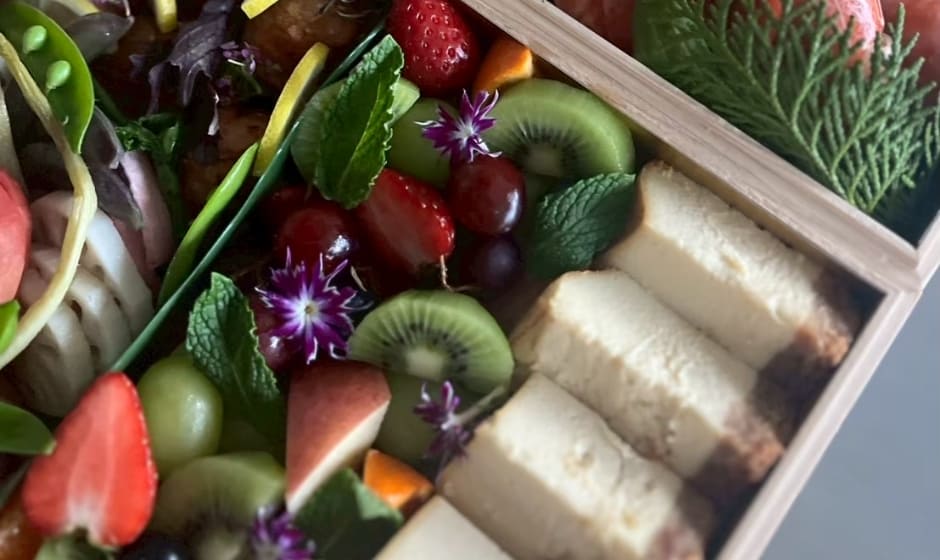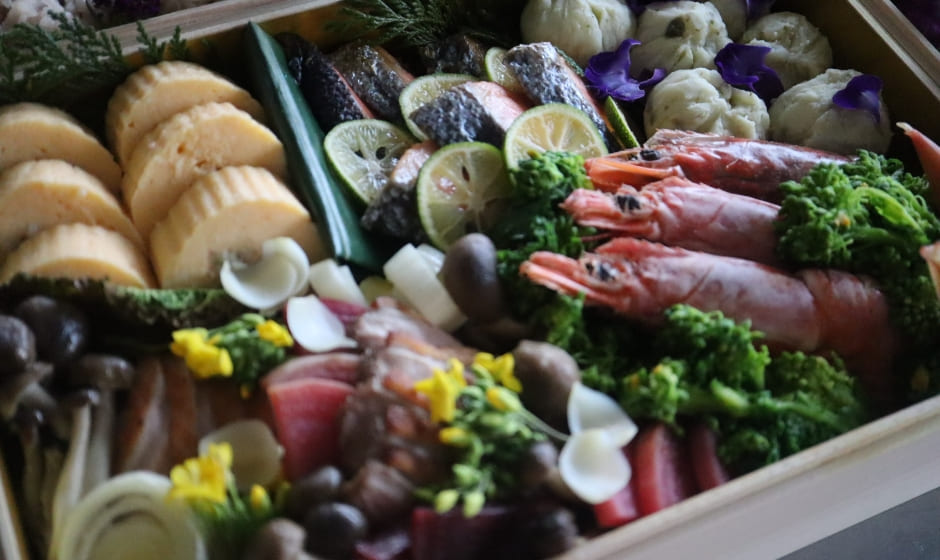 木箱:季節のお料理の盛り合わせ 8品お肉・お魚・野菜をふんだんに使用した季節のお料理を6品、炭水化物を1品、甘味1品の全8品を木箱に盛合せてお届けします。
