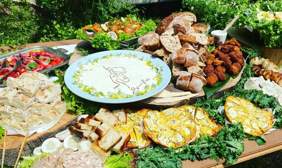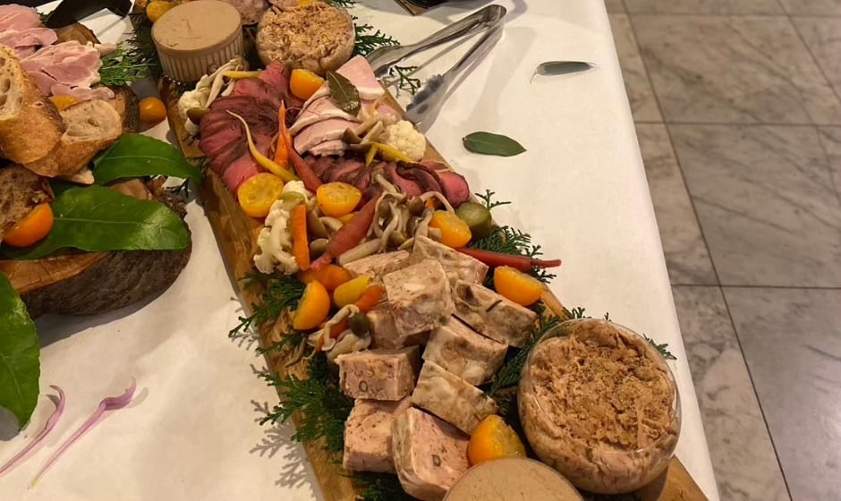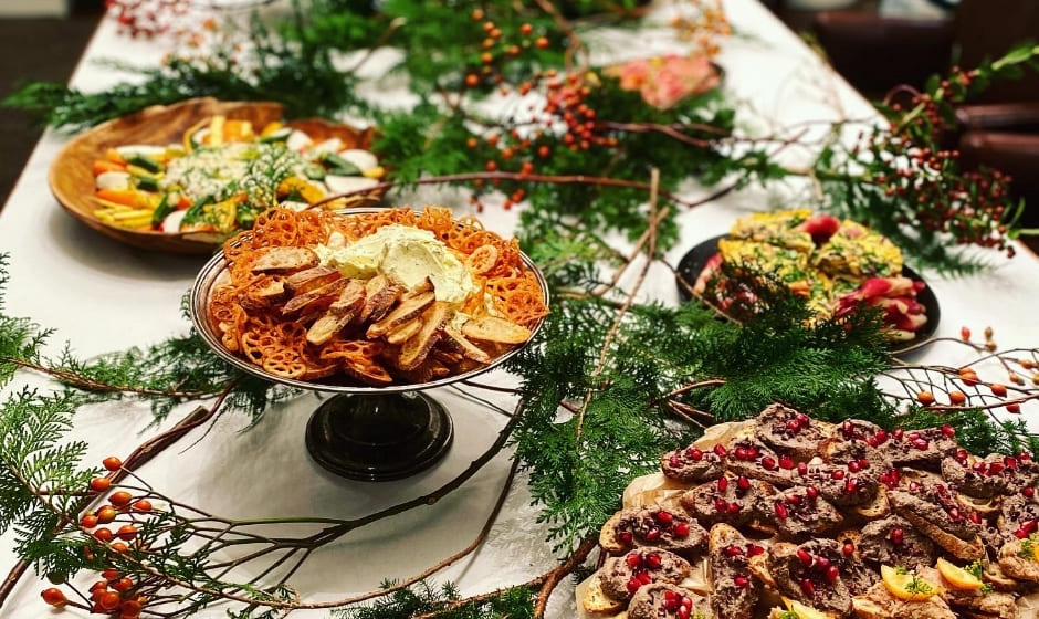 ・メニュー例:玉蜀黍のケークサレ・鶏の塩麹梨ハラペーニョ・海老とカリフラワーの春巻き・鮭の酢橘幽庵焼き・半熟卵の西京味噌漬け・自家製リエットとリンゴのサンドイッチ・巨峰ゼリーなど