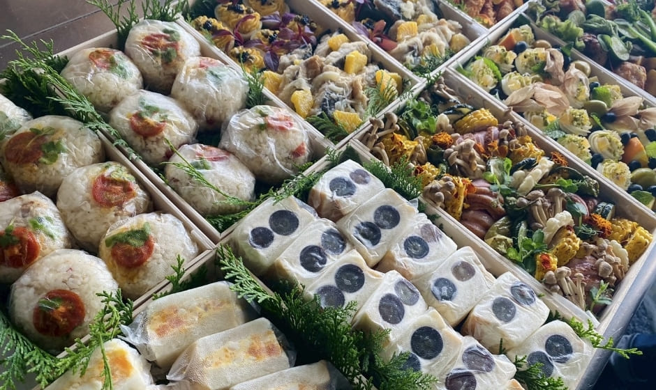 おむすび2種類、サンドイッチ1種類、フルーツサンド1種類、旬のお惣菜6種類とお野菜、フルーツ盛り合わせです。