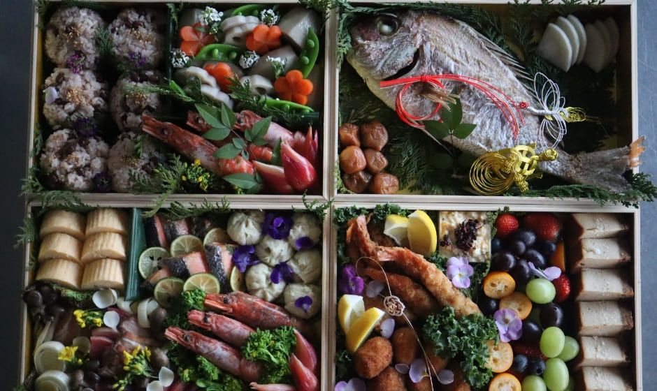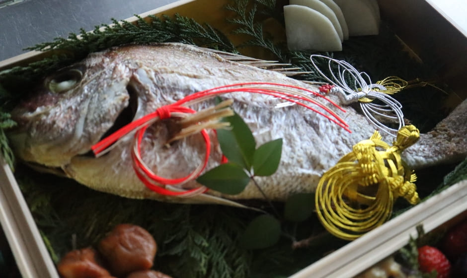赤飯・鯛の尾頭付き重(4名様分)木の重箱に鯛の尾頭付きや、お赤飯など縁起の良い食事をお詰めします。